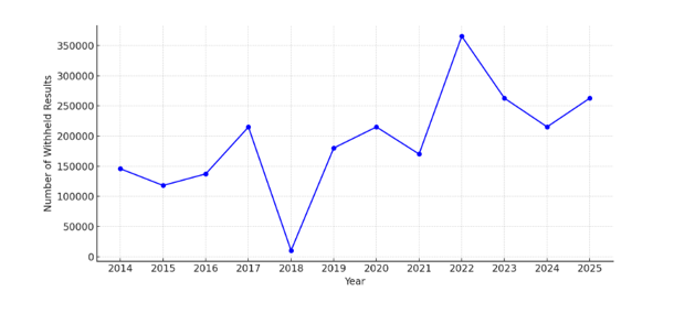 Figure showing WAEC Withheld Results (2014-2025)