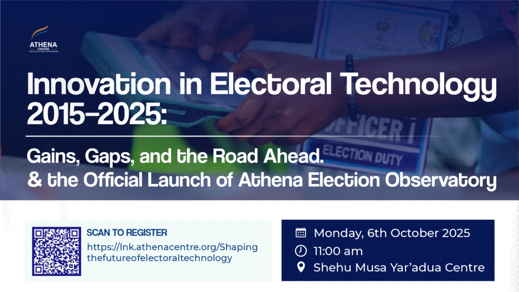 Athena Centre for Policy and Leadership proudly presents the launch of the Athena Election Observatory alongside the groundbreaking report Innovation in Electoral Technology 2015–2025: Gains, Gaps, and the Road Ahead. This high-level event will convene election experts, policymakers, and civil society leaders to reflect on a decade of electoral technology reforms and chart the future of credible elections in Nigeria.